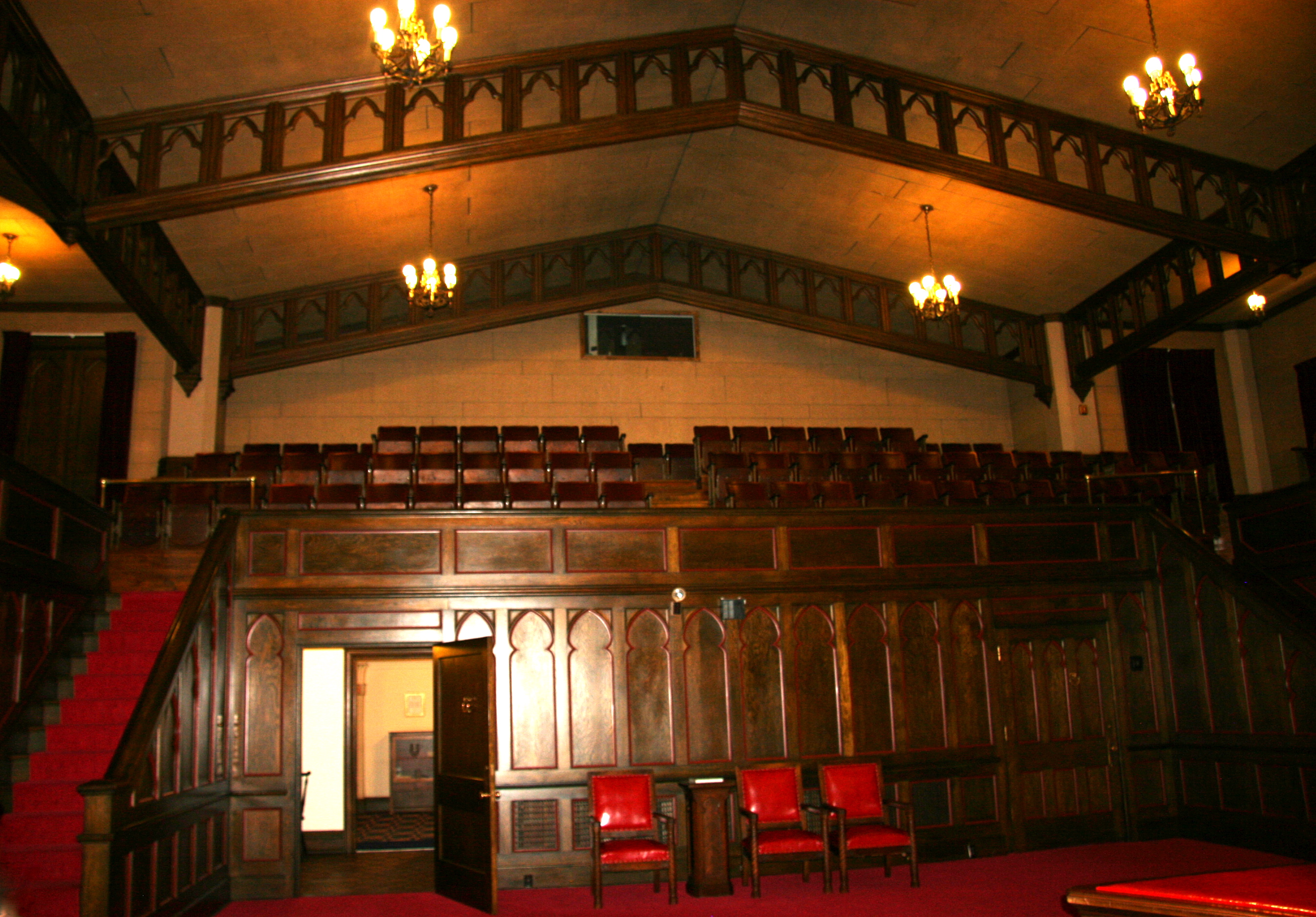 The paneling and beams are antique oak. The red furniture and the leather seat in the balcony are original. The nature of the rites performed in this room do not require the winding staircase found in the other three lodge rooms. |
