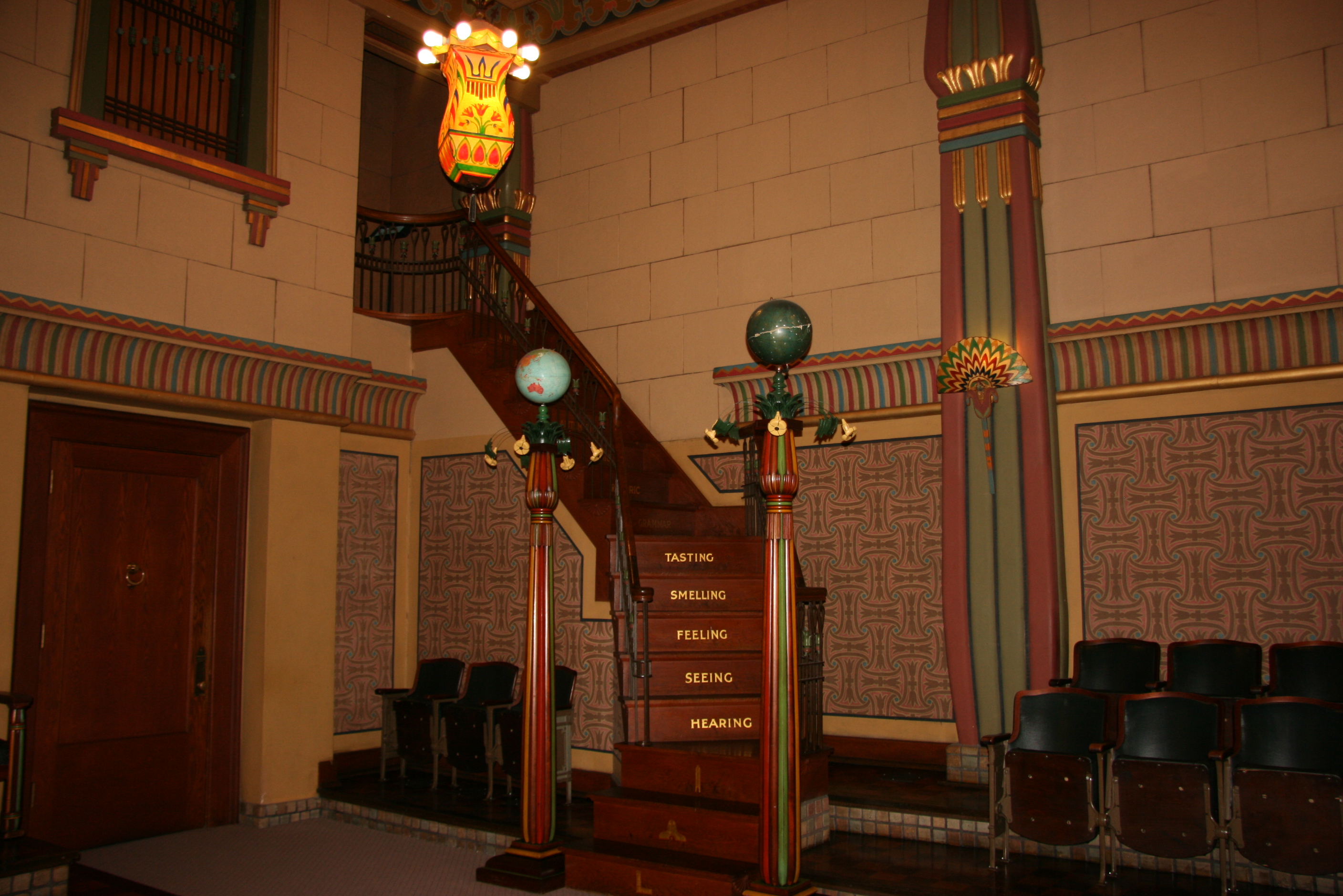 The staircase has sets of three, five and seven steps representing the teachings of Masonry: Three principal officers of the lodge, five human senses and seven liberal arts and sciences. These symbolic steps are also found in other rooms of the temple as well as in the number of steps leading to the three main entry doors at the front of the temple. The globes on top of the pilars represent the Terrestrial and Celestial spheres. |